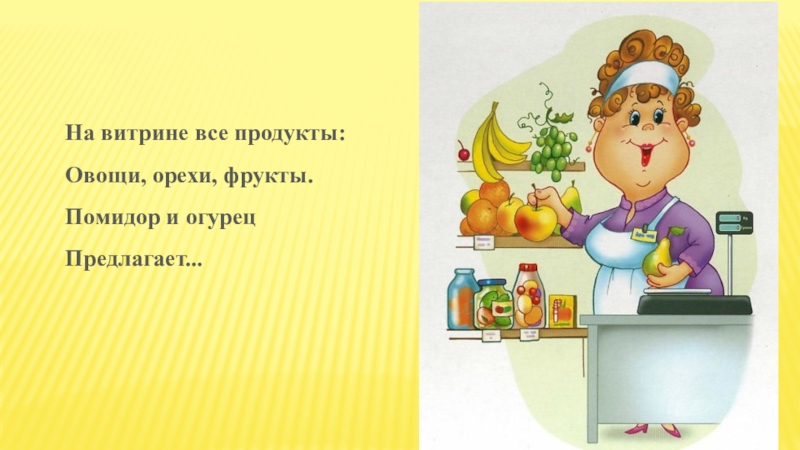 На витрине все продукты:Овощи, орехи, фрукты.Помидор и огурецПредлагает...