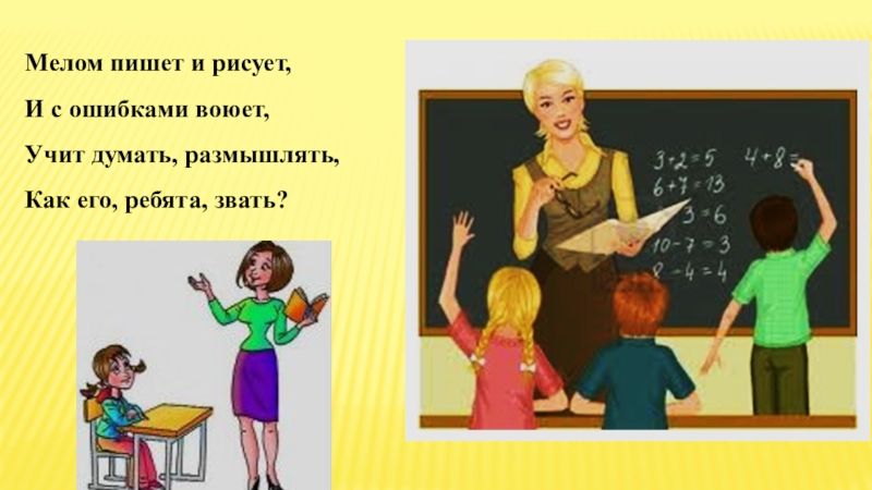 Мелом пишет и рисует,И с ошибками воюет,Учит думать, размышлять,Как его, ребята, звать?