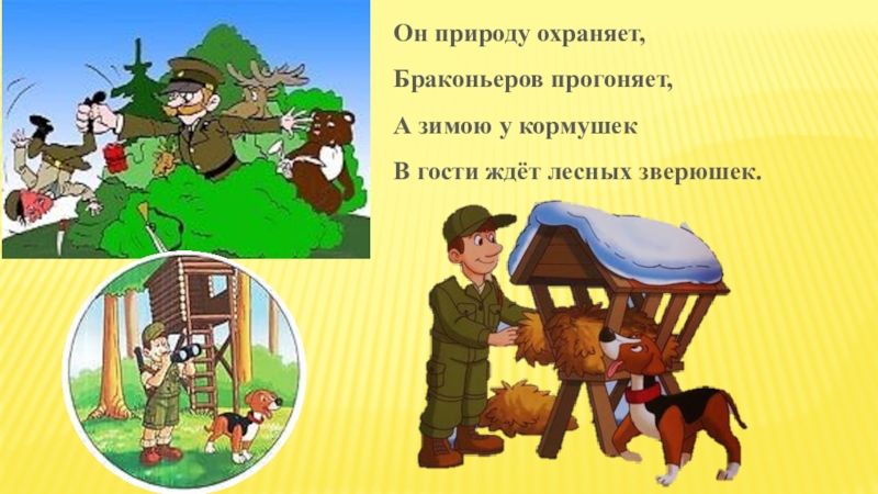 Он природу охраняет,Браконьеров прогоняет,А зимою у кормушекВ гости ждёт лесных зверюшек.