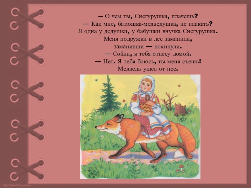 — О чем ты, Снегурушка, плачешь?— Как мне, батюшка-медведушка, не плакать? Я одна у дедушки, у бабушки