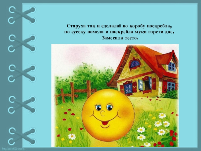 Старуха так и сделала: по коробу поскребла, по сусеку помела и наскребла муки горсти две. Замесила тесто.