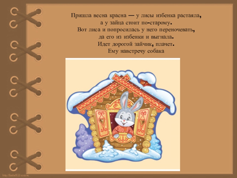 Пришла весна красна — у лисы избенка растаяла, а у зайца стоит по-старому. Вот лиса и попросилась