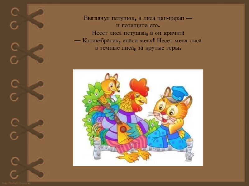 Выглянул петушок, а лиса цап-царап — и потащила его.Несет лиса петушка, а он кричит:— Котик-братик, спаси меня!