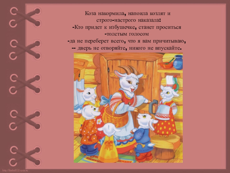 Коза накормила, напоила козлят и строго-настрого наказала:Кто придет к избушечке, станет проситься толстым голосом да не переберет