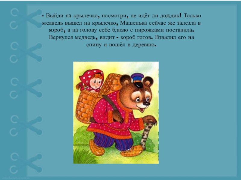- Выйди на крылечко, посмотри, не идёт ли дождик! Только медведь вышел на крылечко, Машенька сейчас же
