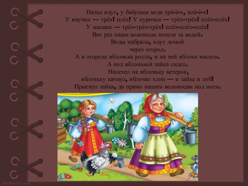 Назад идут, у бабушки вода трё-ё-х, плё-ё-х! У внучки — трёх! плёх! У курочки — трёх-трёх! плёх-плёх!