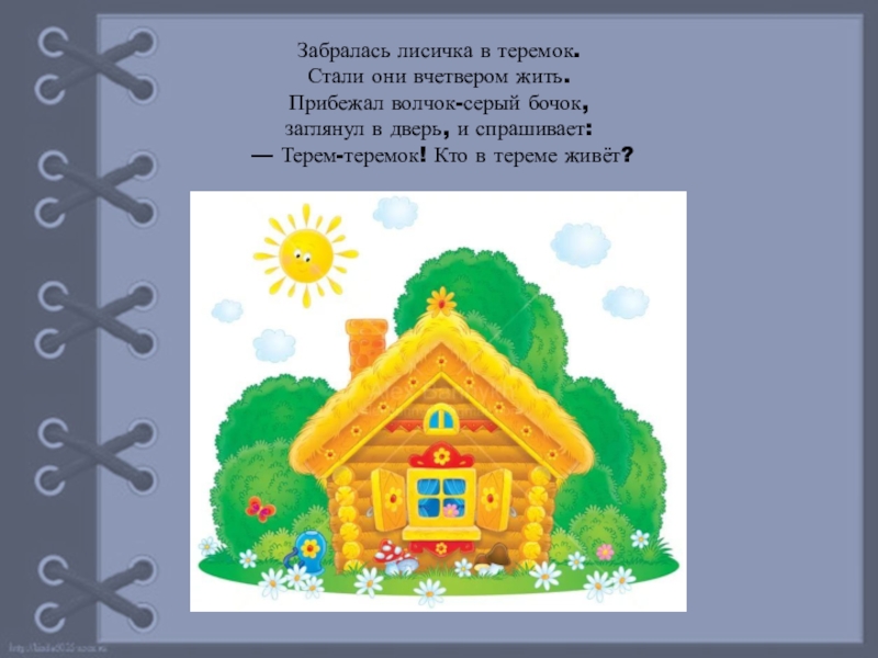 Забралась лисичка в теремок. Стали они вчетвером жить.Прибежал волчок-серый бочок, заглянул в дверь, и спрашивает: — Терем-теремок!