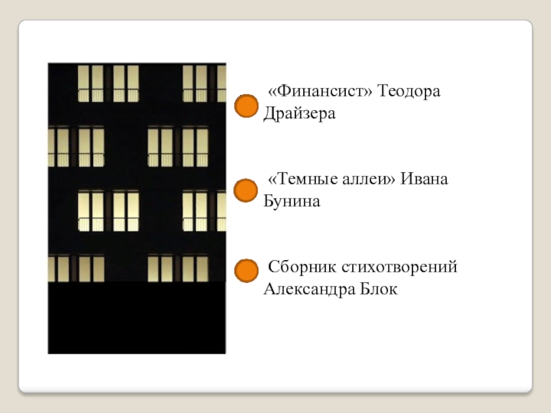 «Финансист» Теодора Драйзера «Темные аллеи» Ивана Бунина Сборник стихотворений Александра Блок