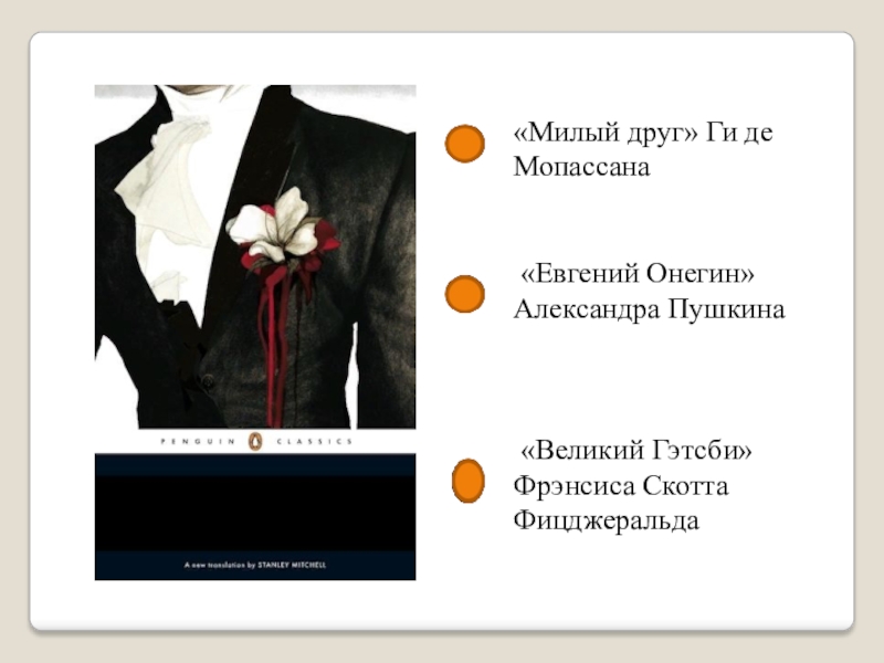 «Милый друг» Ги де Мопассана «Евгений Онегин» Александра Пушкина «Великий Гэтсби» Фрэнсиса Скотта Фицджеральда