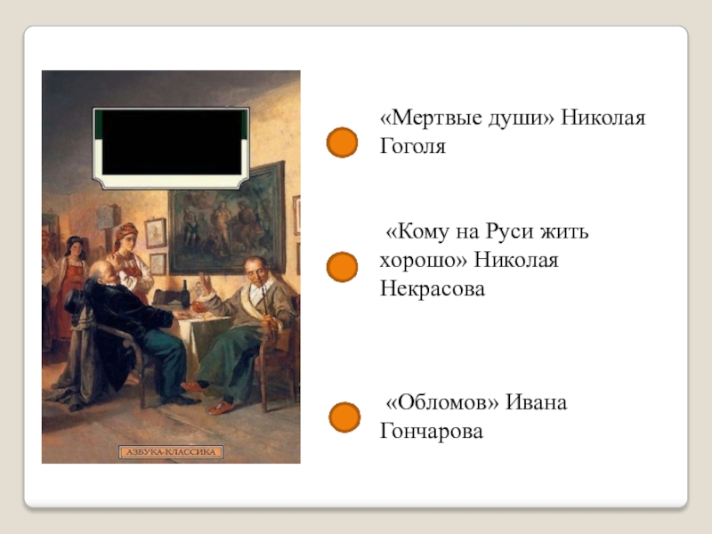 «Мертвые души» Николая Гоголя «Кому на Руси жить хорошо» Николая Некрасова «Обломов» Ивана Гончарова