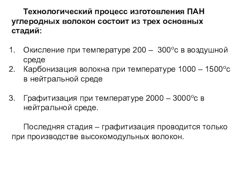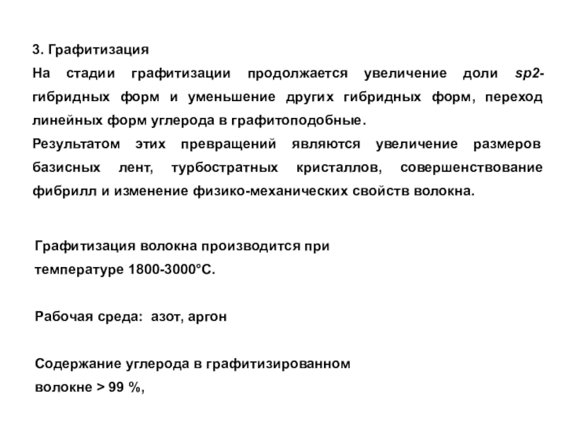 при температуре >1200С происходят преимущественно физические изменения, связанные с совершенствованием структуры углеродного волокна, переход линейных форм углерода в графитоподобные, формируются физико-механические свойства волокна