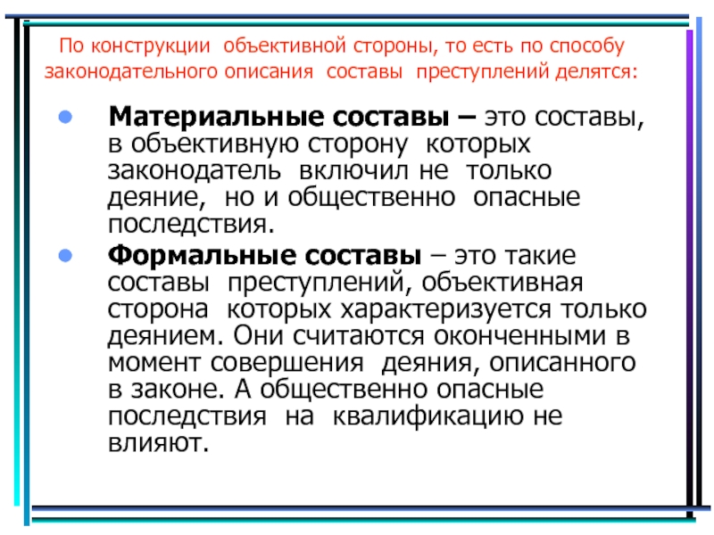 Слайд 17По конструкции объективной стороны, то есть по способу законодательного описания