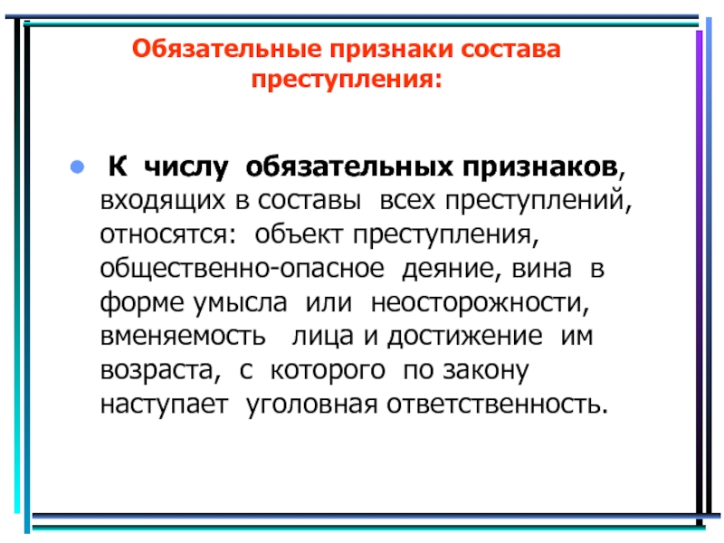 Слайд 12ОБЯЗАТЕЛЬНЫЕ И ФАКУЛЬТАТИВНЫЕ ПРИЗНАКИ СОСТАВА ПРЕСТУПЛЕНИЯ:
