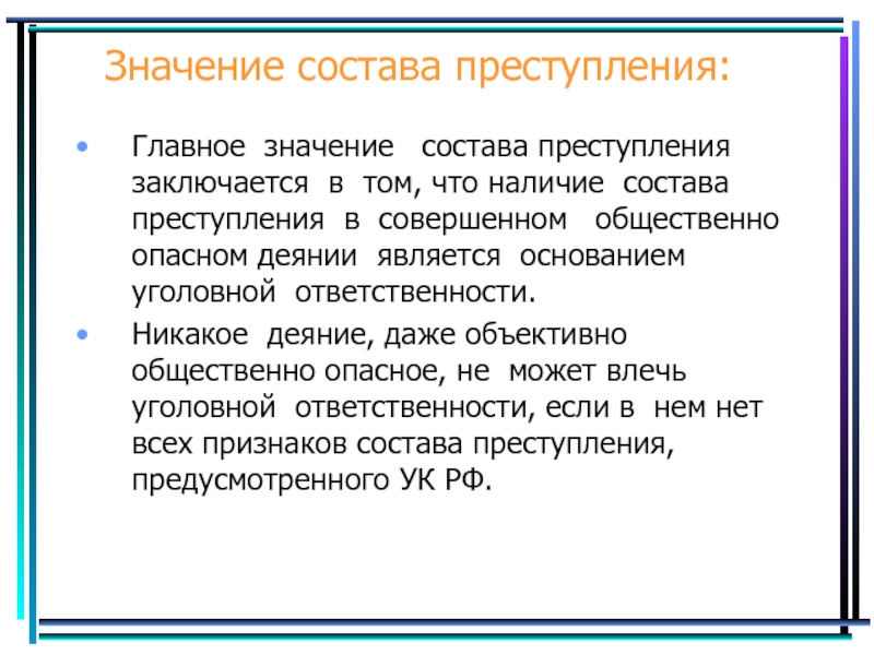 Никакое деяние, даже объективно общественно опасное, не может влечь уголовной ответственности, если в нем нет всех признаков состава преступления, предусмотренного УК РФ.