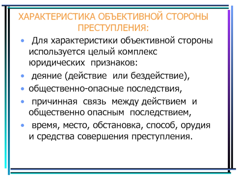 Слайд 8ХАРАКТЕРИСТИКА ОБЪЕКТИВНОЙ СТОРОНЫ ПРЕСТУПЛЕНИЯ: