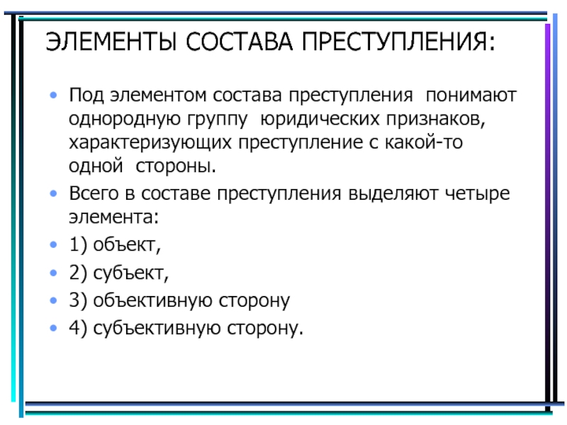 Слайд 4ЭЛЕМЕНТЫ СОСТАВА ПРЕСТУПЛЕНИЯ: