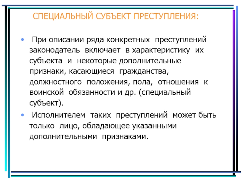Слайд 11СПЕЦИАЛЬНЫЙ СУБЪЕКТ ПРЕСТУПЛЕНИЯ: