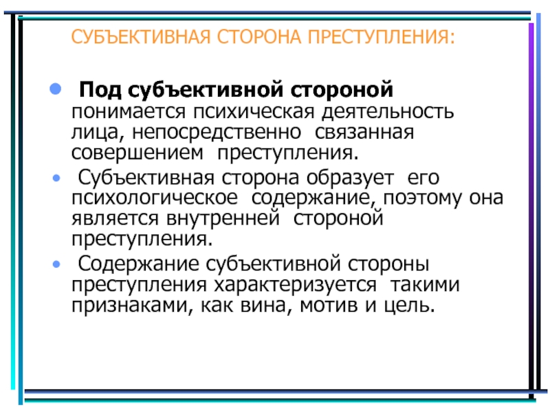 Слайд 9СУБЪЕКТИВНАЯ СТОРОНА ПРЕСТУПЛЕНИЯ: