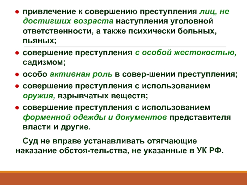 Суд не вправе устанавливать отягчающие наказание обстоя-тельства, не указанные в УК РФ.