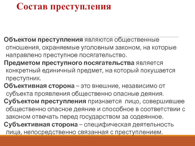 Слайд 17Состав преступления – совокупность необходимых объективных и субъективных элементов общественно