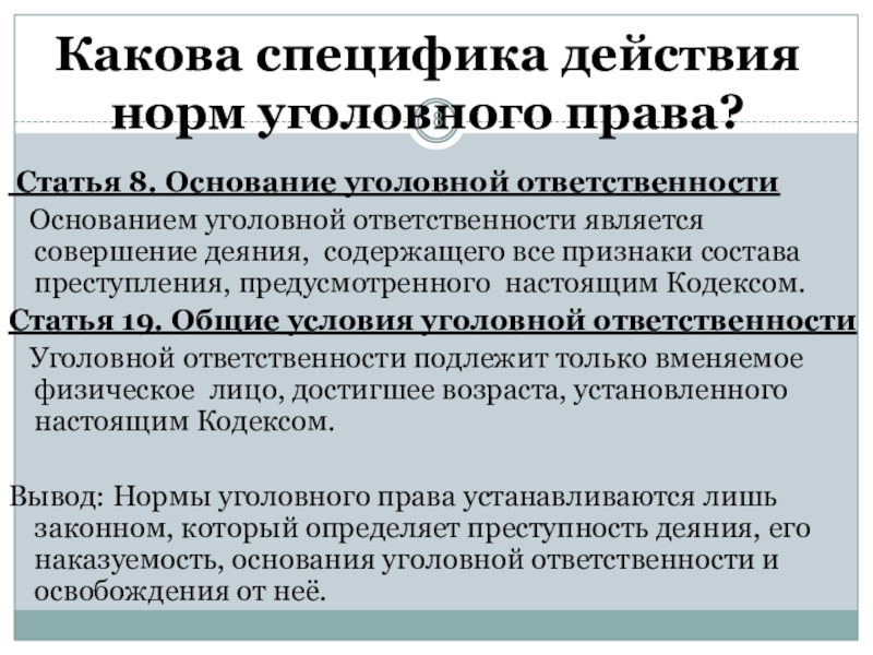 Слайд 8Какова специфика действия норм уголовного права?