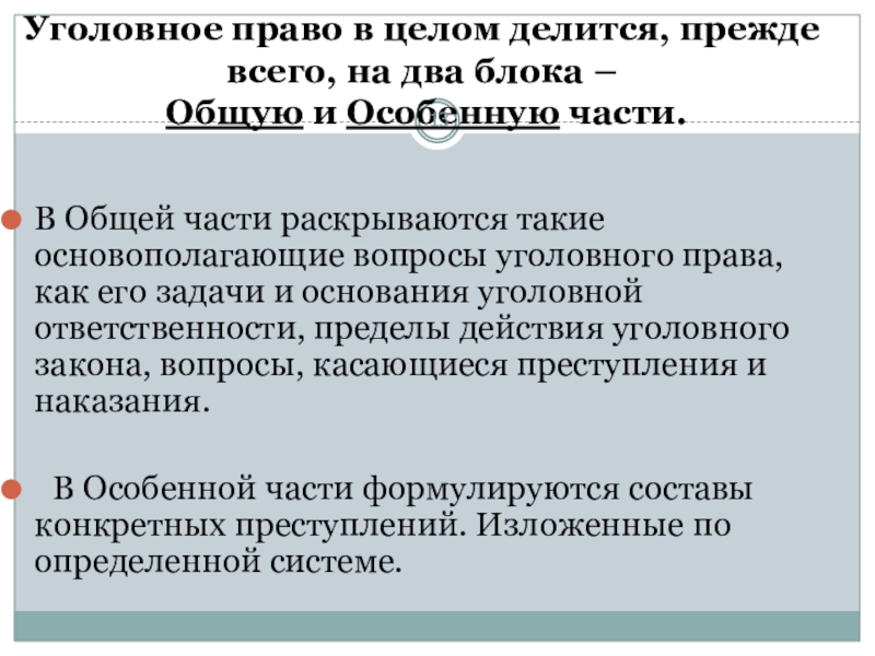 Слайд 13Уголовное право в целом делится, прежде всего, на два блока