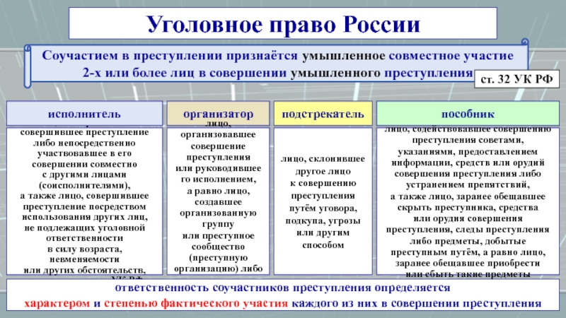 тот, кто перед совершением преступления либо во время его совершения, совершил деяние для того, чтобы сделать возможным совершение преступления, а равно облегчить его совершение или обеспечить охрану преступления, либо предотвратить захват исполнителя, раскрытие преступления или обнаружение предметов, добытых преступным путём, либо чтобы внести вклад другим способом в создание условий