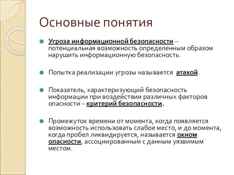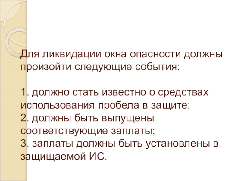 воздействии различных факторов опасности – критерий безопасности. Промежуток времени от момента, когда появляется возможность использовать слабое место, и до момента, когда пробел ликвидируется, называется окном опасности, ассоциированным с данным уязвимым местом.