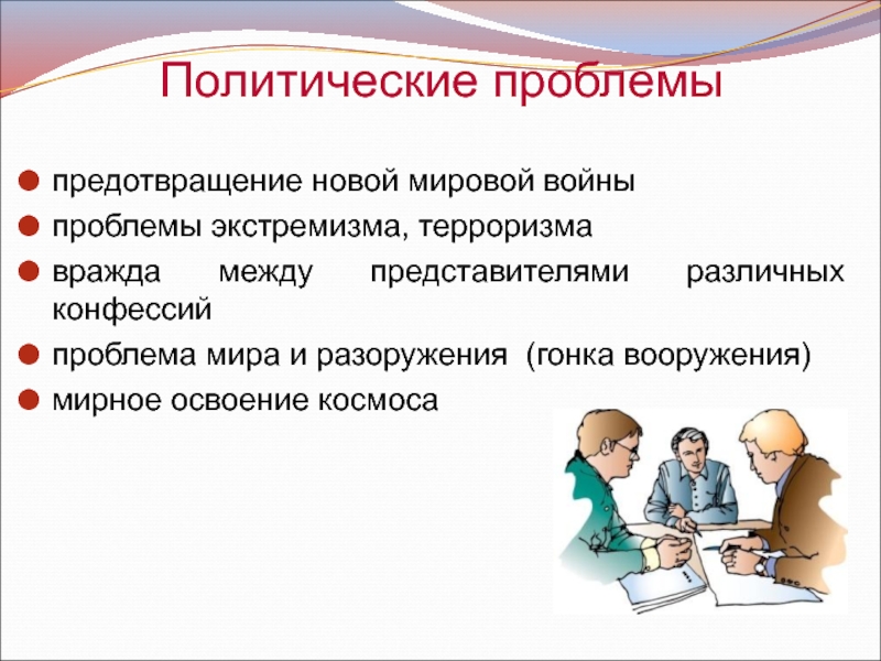 Политические проблемыпредотвращение новой мировой войныпроблемы экстремизма, терроризмавражда между представителями различных конфессийпроблема мира и разоружения (гонка вооружения) мирное