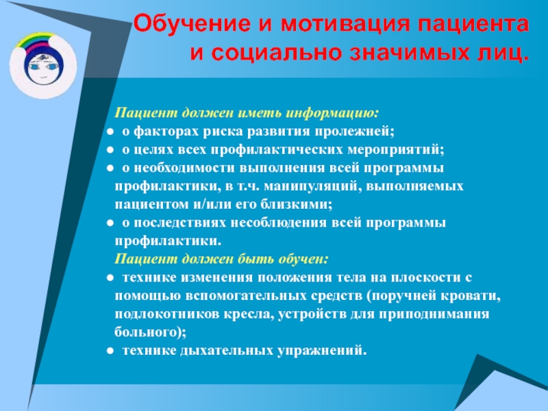 Слайд 28Обучение и мотивация пациента и социально значимых лиц.