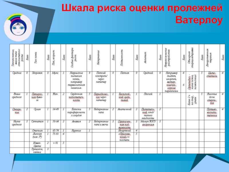 Слайд 11Шкала риска оценки пролежней Ватерлоу
