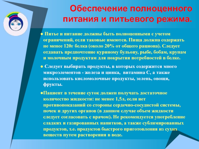 Слайд 26Обеспечение полноценного питания и питьевого режима.