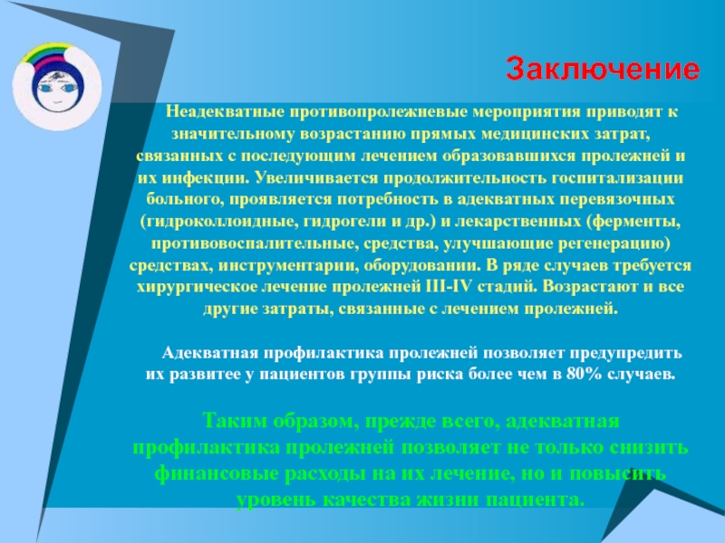 Таким образом, прежде всего, адекватная профилактика пролежней позволяет не только снизить финансовые расходы на их лечение, но и повысить уровень качества жизни пациента.