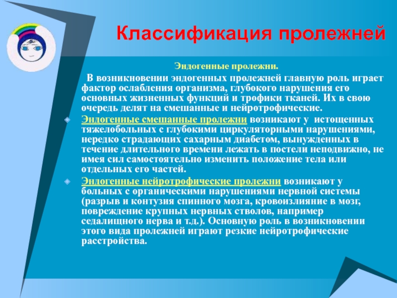 Эндогенные нейротрофические пролежни возникают у больных с органическими нарушениями нервной системы (разрыв и контузия спинного мозга, кровоизлияние в мозг, повреждение крупных нервных стволов, например седалищного нерва и т.д.). Основную роль в возникновении этого вида пролежней играют резкие нейротрофические расстройства.