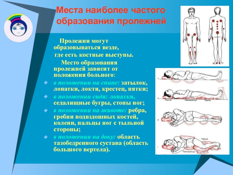 в положении на животе: ребра, гребни подвздошных костей, колени, пальцы ног с тыльной стороны;