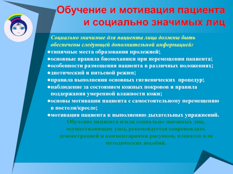Обучение пациента и/или социально значимых лиц, осуществляющих уход, рекомендуется сопровождать демонстрацией и комментариями рисунков, плакатов или методических пособий.