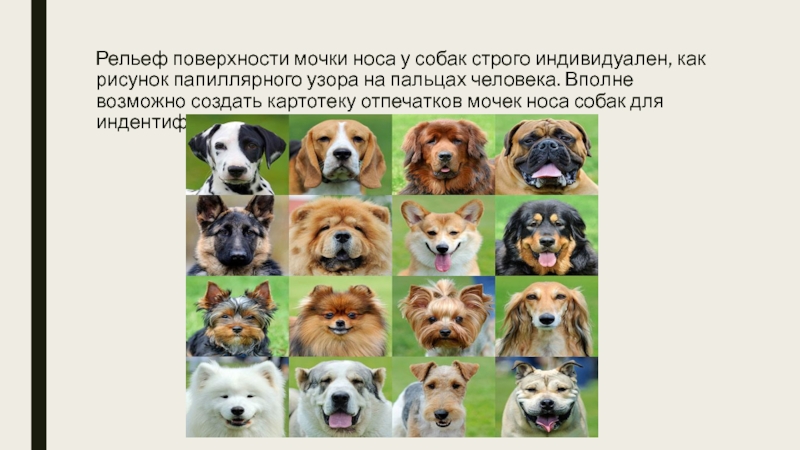 Слайд 6Рельеф поверхности мочки носа у собак строго индивидуален, как рисунок