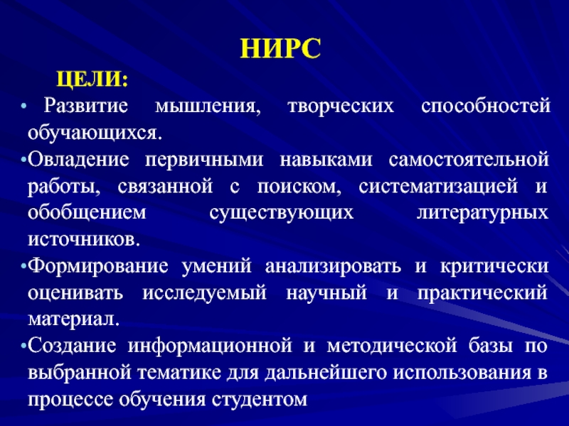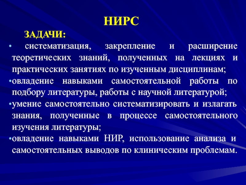 овладение навыками НИР, использование анализа и самостоятельных выводов по клиническим проблемам.