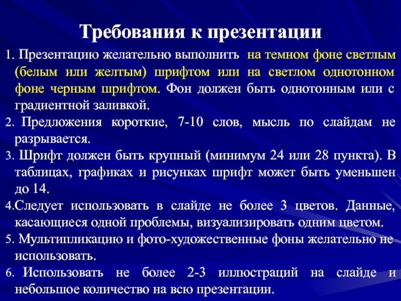 Шрифт должен быть крупный (минимум 24 или 28 пункта). В таблицах, графиках и рисунках шрифт может быть уменьшен до 14.