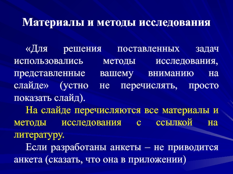 На слайде перечисляются все материалы и методы исследования с ссылкой на литературу.