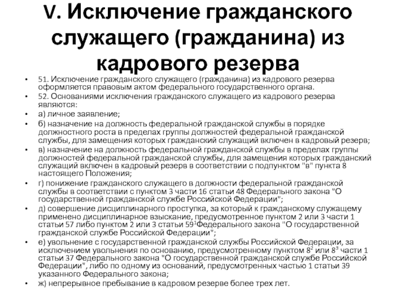 Слайд 20V. Исключение гражданского служащего (гражданина) из кадрового резерва