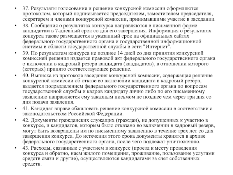 36. Решение конкурсной комиссии принимается в отсутствие кандидатов и является основанием для включения кандидата (кандидатов) в кадровый резерв для замещения должностей федеральной гражданской службы соответствующей группы либо отказа во включении кандидата (кандидатов) в кадровый резерв.