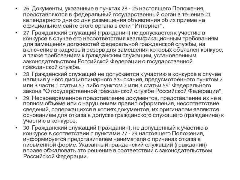 29. Несвоевременное представление документов, представление их не в полном объеме или с нарушением правил оформления, несоответствие сведений, содержащихся в копиях документов, их оригиналам являются основанием для отказа в допуске гражданского служащего (гражданина) к участию в конкурсе.