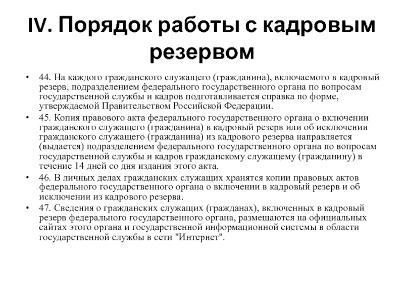 Слайд 18IV. Порядок работы с кадровым резервом