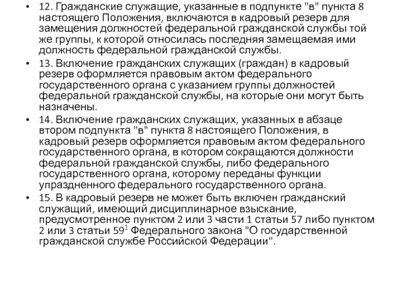 15. В кадровый резерв не может быть включен гражданский служащий, имеющий дисциплинарное взыскание, предусмотренное пунктом 2 или 3 части 1 статьи 57 либо пунктом 2 или 3 статьи 591 Федерального закона "О государственной гражданской службе Российской Федерации".