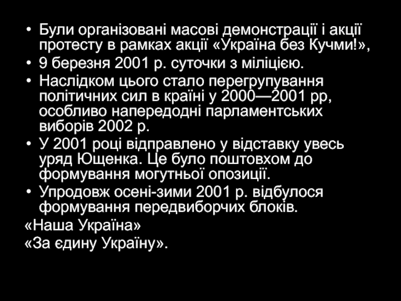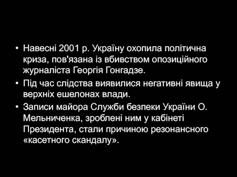 Слайд 12Навесні 2001 р. Україну охопила політична криза, пов'язана із вбивством опозиційного