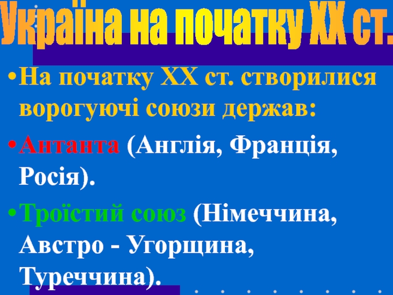 Слайд 3На початку XX ст. створилися ворогуючі союзи держав:
