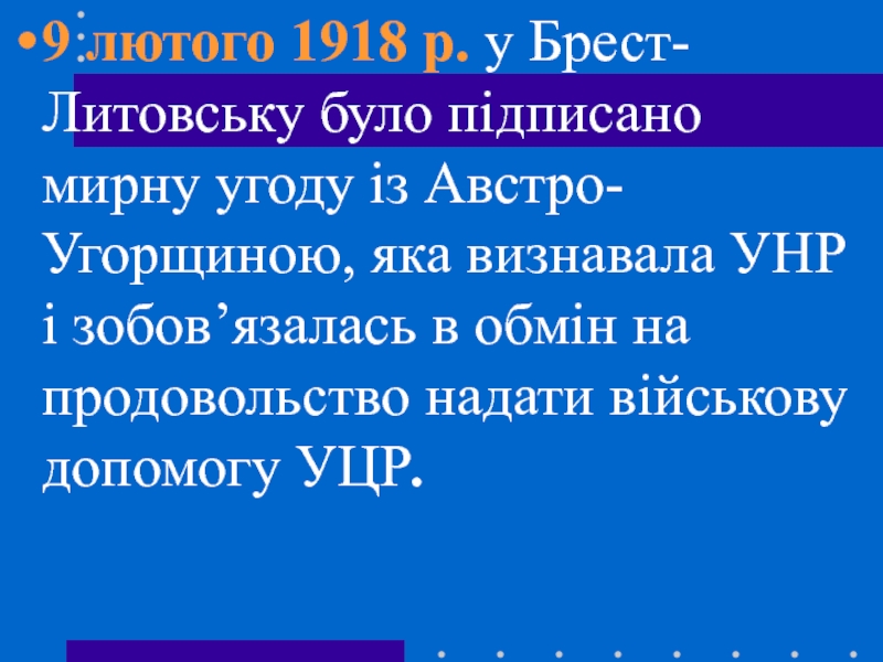 Слайд 439 лютого 1918 р. у Брест-Литовську було підписано мирну угоду
