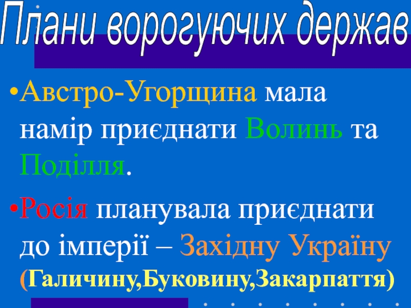 Слайд 7Австро-Угорщина мала намір приєднати Волинь та Поділля.