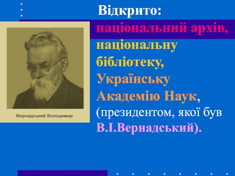 Слайд 49 Відкрито: національний архів, національну бібліотеку, Українську Академію Наук,